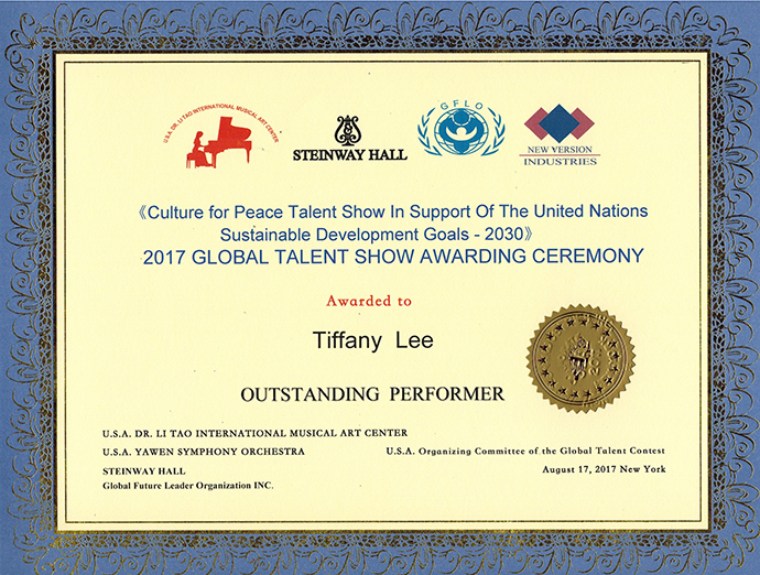 Tiffany Lee is twelve years old. She is currently a seventh grader in Fairfax County, VA. Tiffany has been learning GuZheng with teacher Lei Gu since she was seven. Ever since then, she fell in love with GuZheng. She enjoys learning and practicing GuZheng. One of the things Tiffany loves about GuZheng is that GuZheng has a lot more dynamics than other instruments and she can express herself through the music. Tiffany says: "It is such a wildly diverse instrument and there are so many ways you can play it". Besides GuZheng, Tiffany also practices dance three times a week and Chinese Kungfu twice a week. By learning all these, Tiffany has learned a lot about Chinese cultures. She also gained numerous experiences through these extracurricular activities. Furthermore, she and her friends performed their winning GuZheng piece "Raising the Lanterns" at United Nation. She and her dance team also competed at The World Dance Championship and placed 2nd place out of 30+ competitive teams. Tiffany also has performed at Kennedy Center, Strathmore Music Center and Lincoln Center for the Performing Arts, etc. Tiffany also received her individual 3rd place award at the AAMS Music Competition in 2016. GuZheng has given Tiffany so many opportunities and she will definitely continue to play GuZheng and get better and better. Tiffany is glad that she decided to learn GuZheng five years ago!