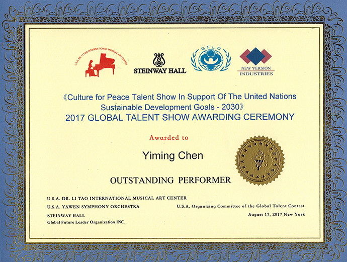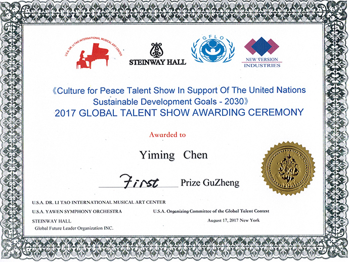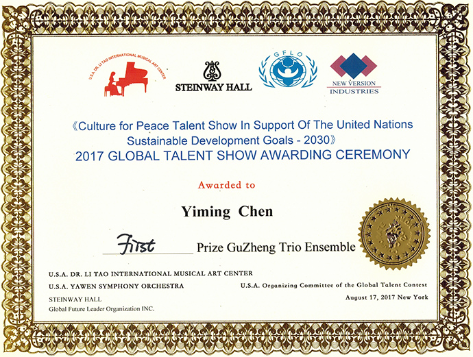 Yiming Chen interest in playing the Guzheng was sparked when she was four, by a neighbor who had bought the instrument. Ever since then, she has continued in my journey of playing the Guzheng. Until now, it is a total of eleven years! When she was four, she started learning at a Guzheng school in Beijing. She had reached level seven at the age of eight when her family moved to Washington, DC. Seeking to continue playing, she brought along her instrument. Fortunately, and to her surprise, she found Ms. Gu! Under her guidance, she was able to progress in the art of playing the Guzheng. She then got the opportunity to participate in various performances and competitions. Some of the awards she has won are 2nd place in the 12-14 division of the Princeton International Music Competition, and 1st place in the 13-18 division of the Cultural for Peace Talent Show in Support of the United Nations Sustainable Development Goals—2030. Playing the Guzheng has set the foundation of all her artistic endeavors. Her hobbies now include oil painting, playing the Hulusi, the ukulele, and the guitar. Guzheng will be her life-long companion, and she am forever grateful for meeting this instrument as well the people that have helped her on the way!