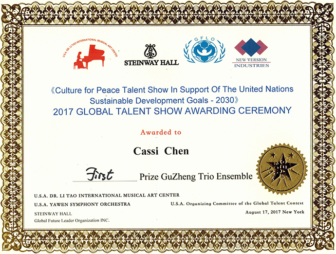 Cassi has been studying Guzheng for seven years under the guidance of Lei Gu from Washington Dunhuang Guzheng Academy. Over the past few years, she appeared in numerous festivals and performances in the metropolitan area. With her dedication to Guzheng, Cassi won the following honors: