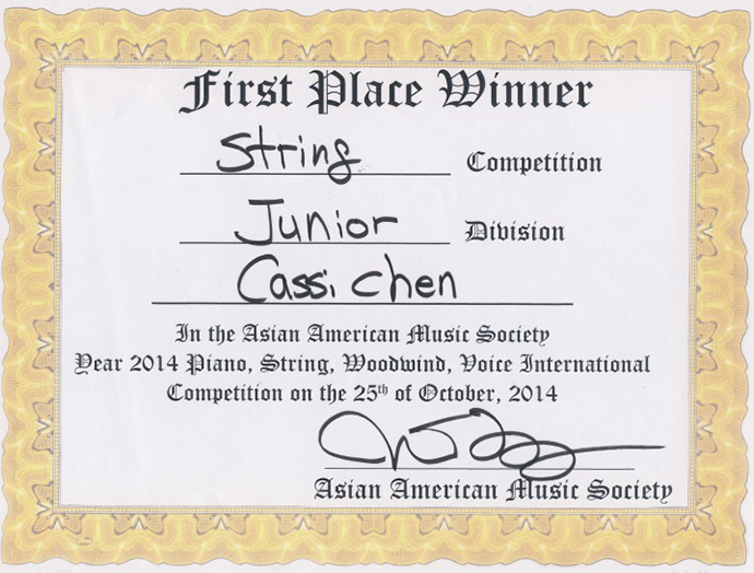 First Place Winner in the junior division of the 2014 Asian American Music Society International String Competition