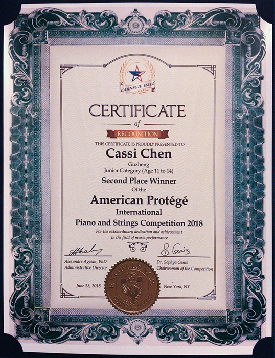 Second Place Winner in the youth group of the 2018 American Protégé International Piano and String Competition