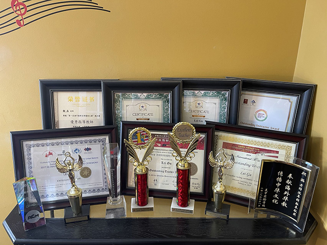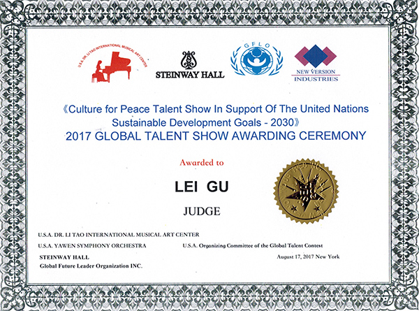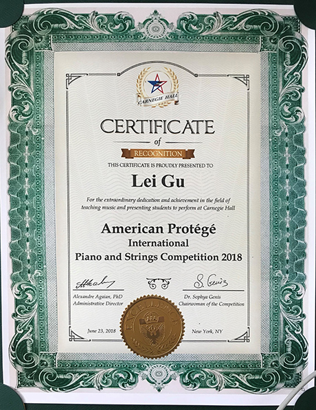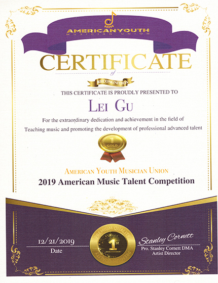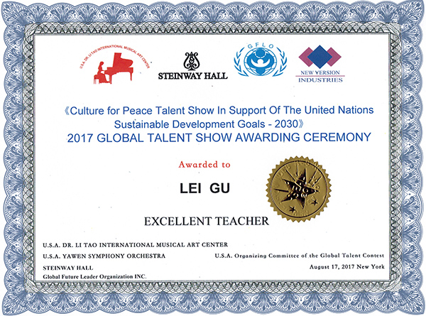 After she founded the Washington Dunhuang Guzheng Academy, she has received wide recognition as a musician and a teacher. She has excellent attitude and passion for music and teaching. She emphasized that skill training for both adults and children are all greatly benefit. In order to create their unique performance style, she began to showcase her talent in various venues across Washington area. In 2010, she and her students successfully held the "The Dream of Dunhuang" guzheng concert, Lei Gu fully displayed her creativity and innovative style in the concert. Her work has been highly acknowledged amongst professional musicians in the Washington Chinese music field.